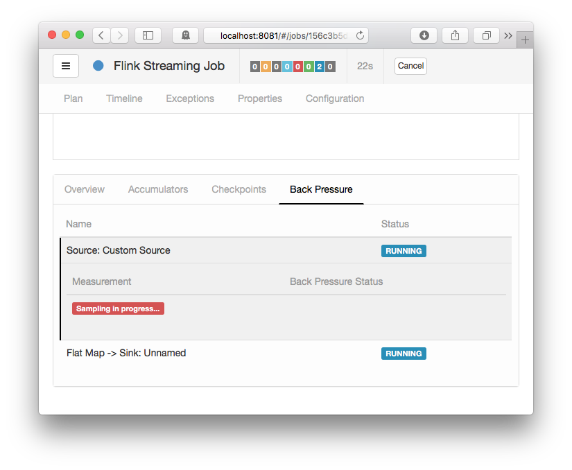 这意味着JobManager触发了正在运行的任务的堆栈跟踪示例。使用默认配置,大约需要5秒钟才能完成。